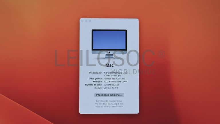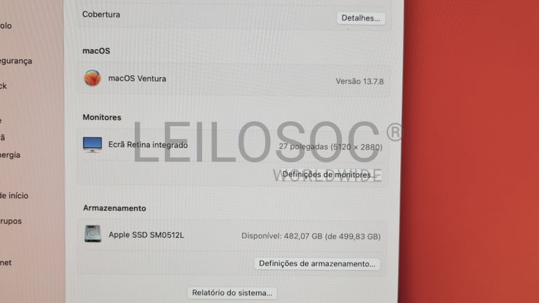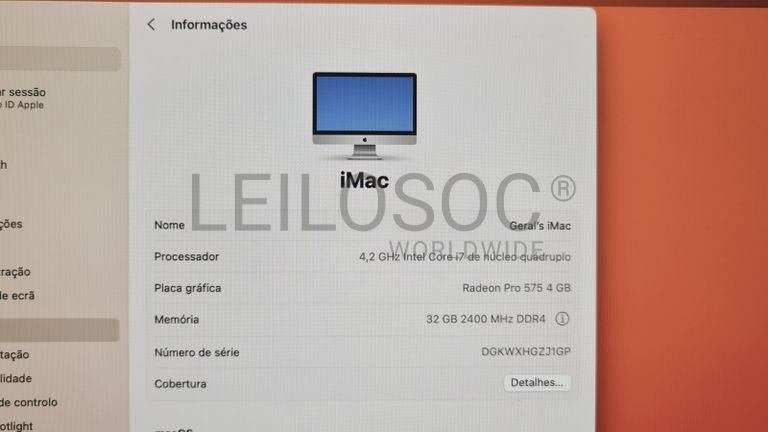 Computador Apple iMac A1419, All In One, com processador Intel Core i7, memória RAM de 32GB, disco SSD de 512GB com ecrã retina integrado de 27", placa gráfica Radeon Pro 575 de 4GB e sistema operativo