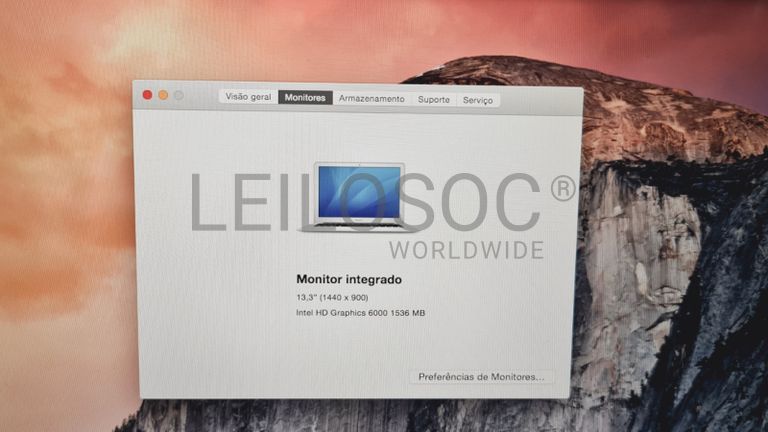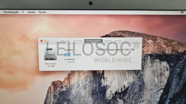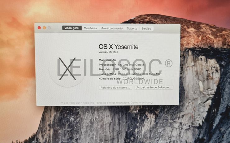 Computador Apple MacBook Air, com processador Intel i5, memória RAM de 4GB, disco de 251GB SSD, ecrã de 13,3" polegadas e sistema operativo macOS X Yosemite.