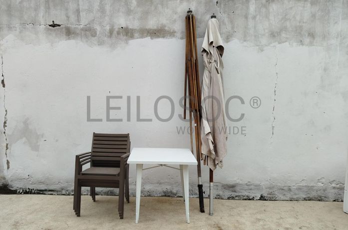Uma mesa de jardim, quatro cadeiras de jardim e duas sombras