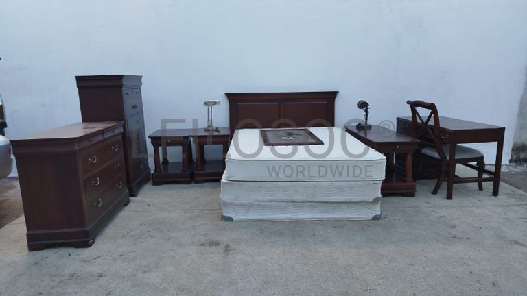 Uma cama de casal, uma base de casal, um encosto de cama, duas cômodas, quatro mesinhas de cabeceira, uma escrivaninha, uma cadeira, dois candeeiros e um espelho