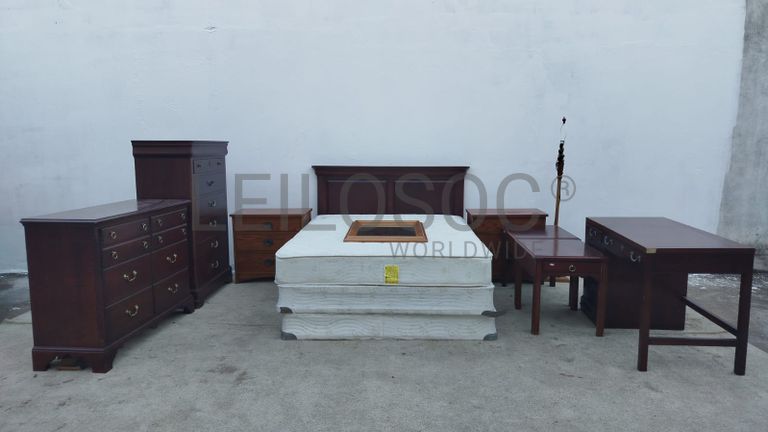 Uma cama de casal, uma base de casal, um encosto de cama, quatro mesinhas de cabeceira, duas cômodas, um espelho, um candeeiro e uma escrivaninha