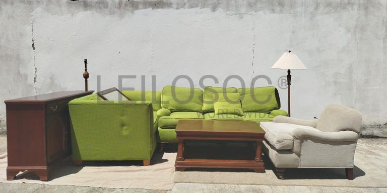 Um sofá de três lugares, um sofá de dois lugares, um sofá de um lugar, uma mesinha de centro, um armário, um espelho e dois candeeiros