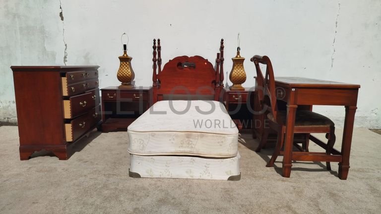 Uma cama de solteiro, duas mesinhas de cabeceira, uma cômoda, dois candeeiros, dois encostos de cama, uma escrivaninha e uma cadeira