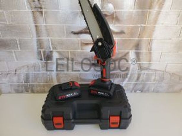 Motosserra elétrica com lâmina de 6 polegadas, com duas baterias incluídas, duas correntes de corte, carregador incluído e chaves como acessórios.