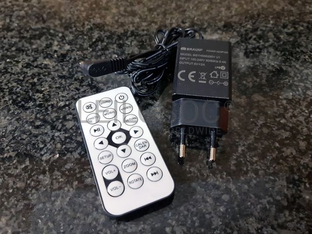 Expositor com leitor multimédia da marca Braun, com leitor de cartões SD, porta USB, Mini HDMI e Jack 3,5mm. Inclui pen USB, adaptador e comando.