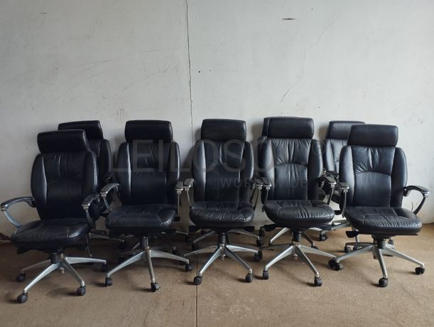 Dez cadeiras giratórias de escritório estofado em couro sintético preto.
