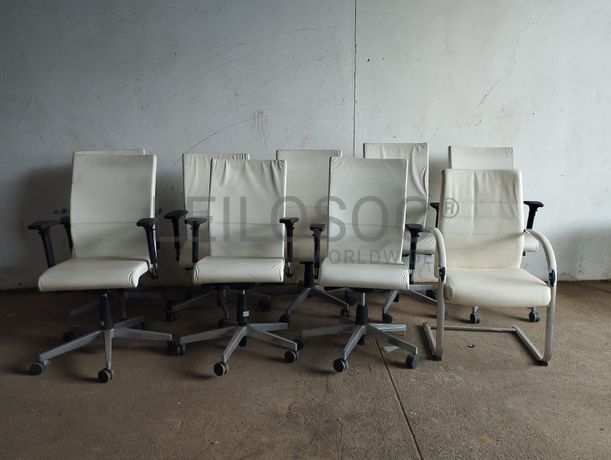 Oito cadeiras brancas giratórias de escritório, com braços ajustáveis e base metálica com rodízios,