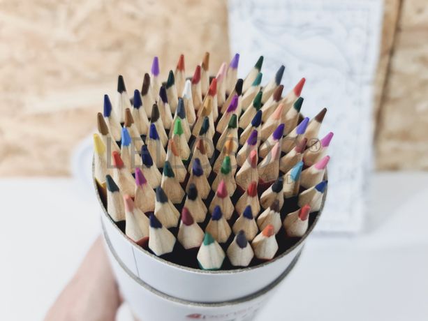 Conjunto de 72 lápis de cor, em madeira reciclada. Inclui estojo, para armazenar ou transportar os lápis.