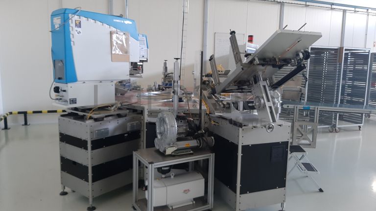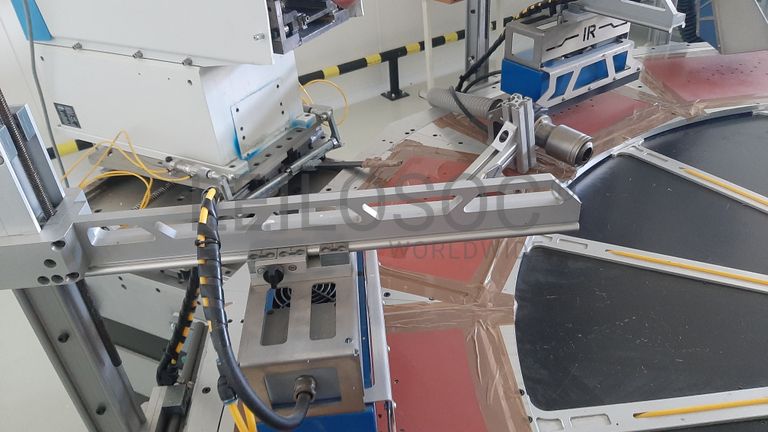 Com impressão, secagem a laser, carregador automático e tapete rolante de saída.