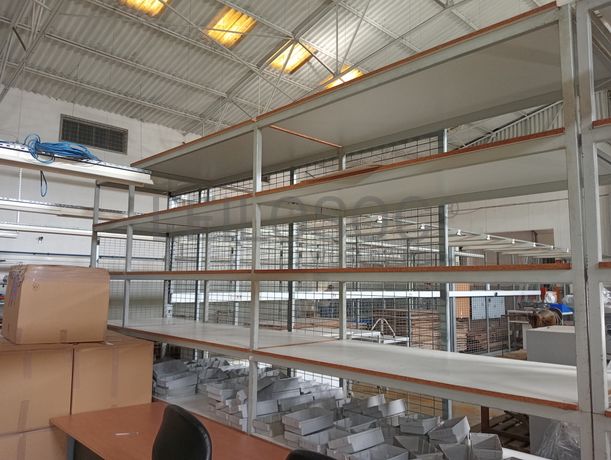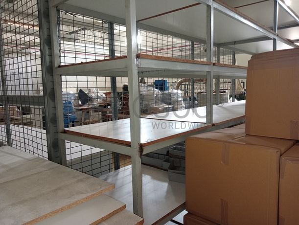 Estante metálica com 3 módulos com cerca de 80 caixas plásticas