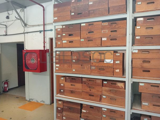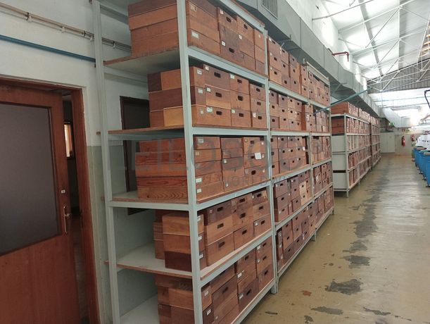 Estante com cerca de 67 caixas de madeira