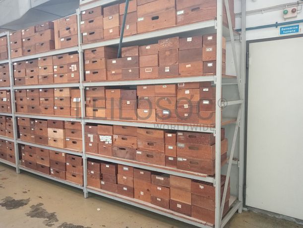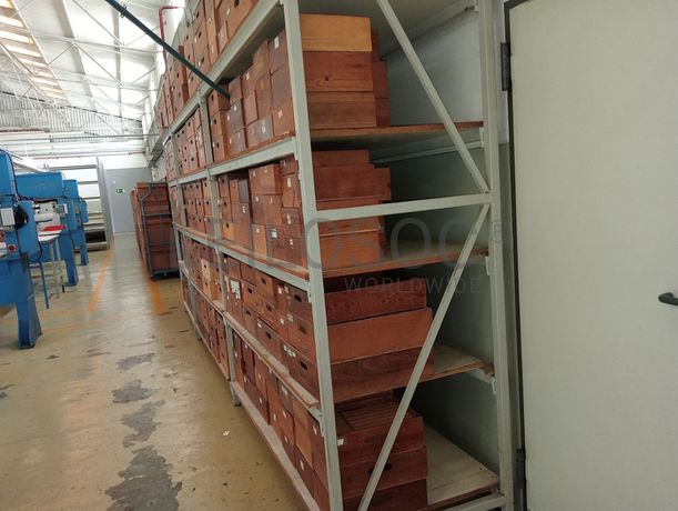 Estante com 2 módulos com cerca de 168 caixas de madeira