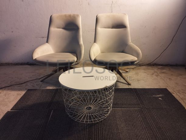 Duas cadeiras estofadas giratórias com base de madeira e mesinha de centro