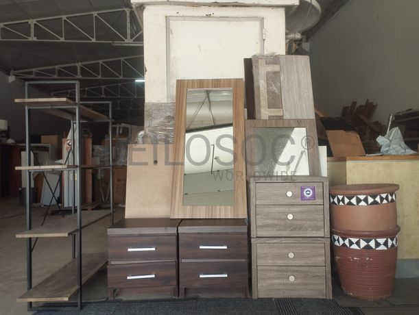 Duas bases de cama de madeira, quatro Cabeceiras, dois espelhos, estante, dois vasos