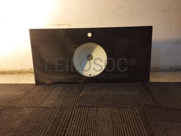 Duas bancadas de casa de banho em granito preto com lavatório de cerâmica embutido