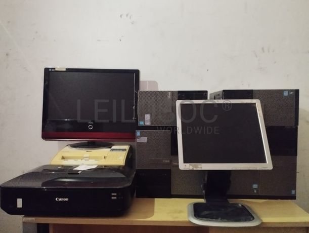 Cinco caixas de PC's marca Dell, Um PC'S marca Dell, um monitor marca HP e TV marca AOC, uma impressora fax marca Canon