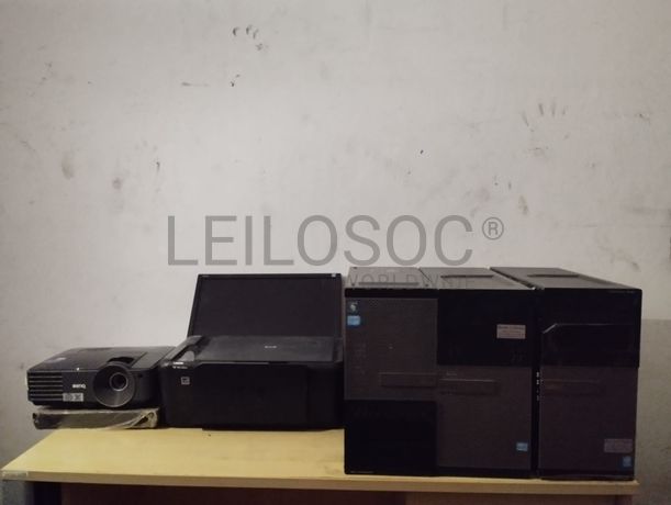 Três caixas de PC'S marca Dell, três monitores sem bases marca LG, Phillips e Aihua; projetor marca BenQ MS502, um scâner marca Epson