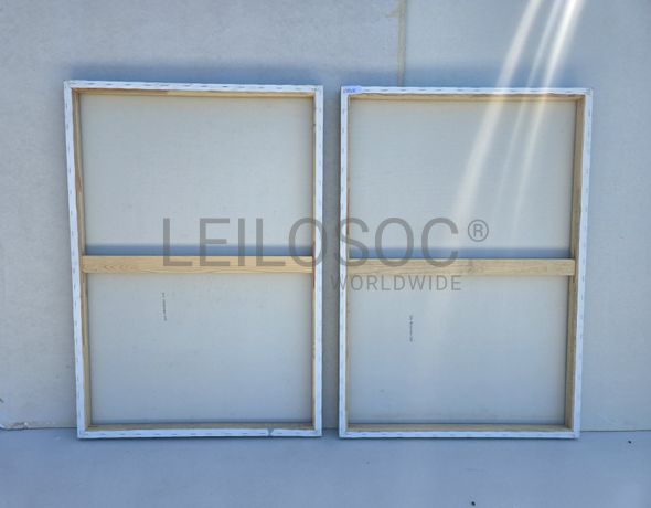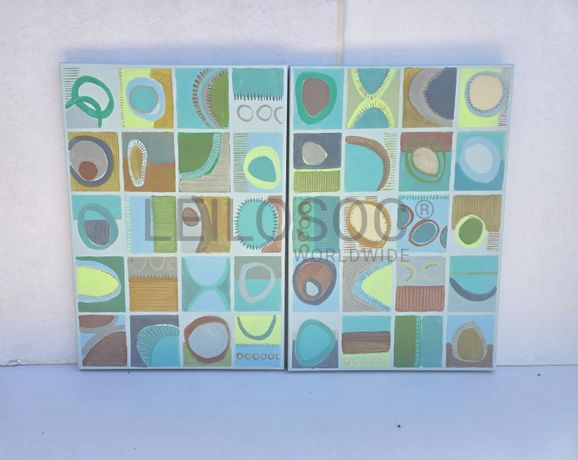 Conjunto de duas telas pintadas à mão, com assinatura de autora, estrutura de madeira, de 100x70 centímetros.