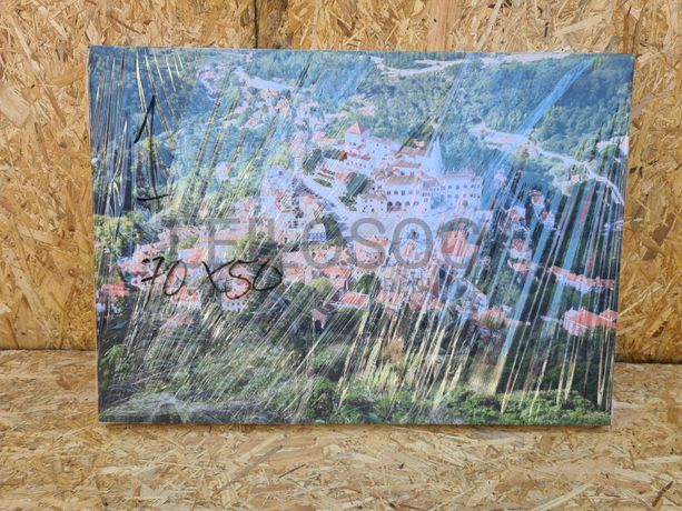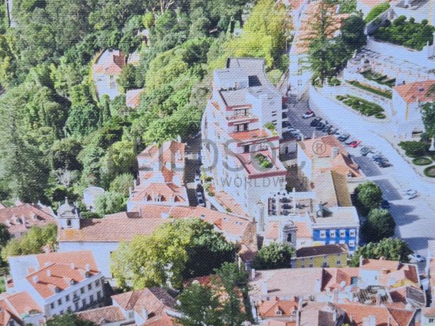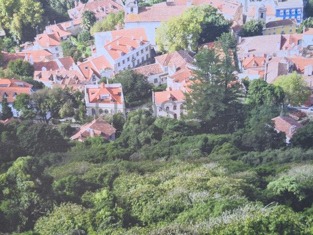 Tela de motivo regional com o Palácio Nacional de Sintra, de 70cm de comprimento e de 50cm de altura, com estrutura em madeira.