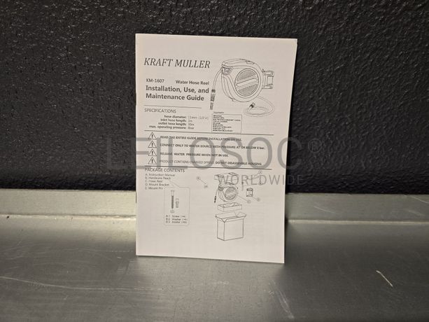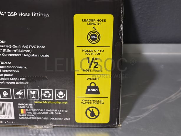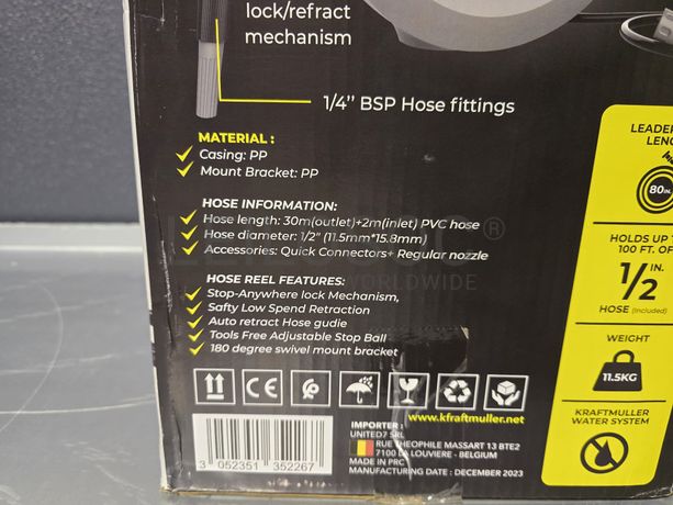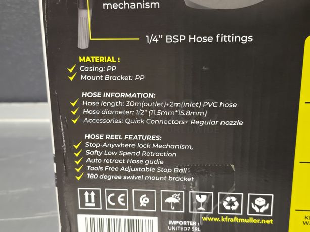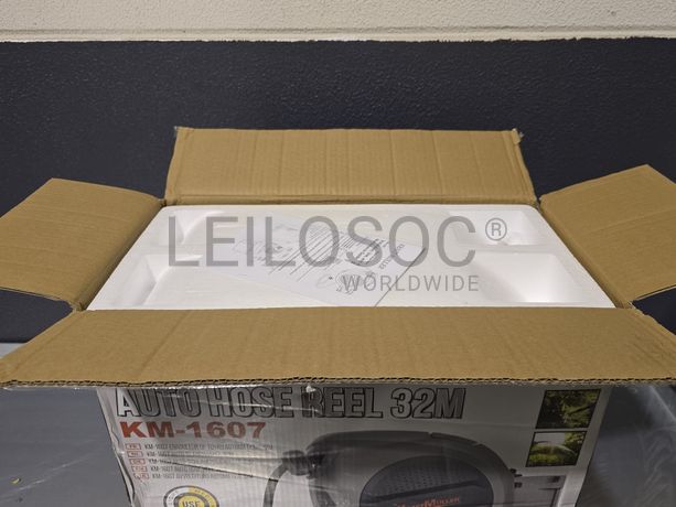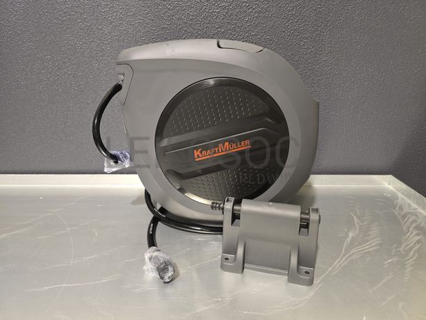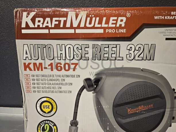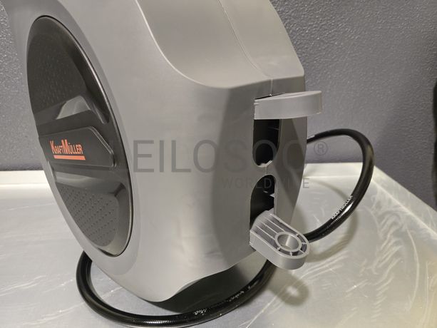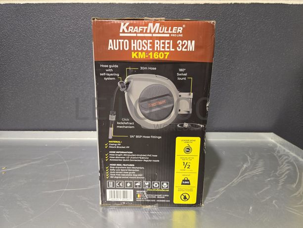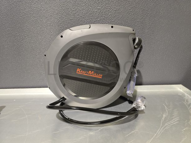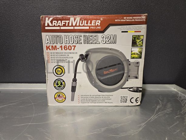Carretel de mangueira de água, da marca KraftMuller, com 32 metros, com acessórios e fixação.