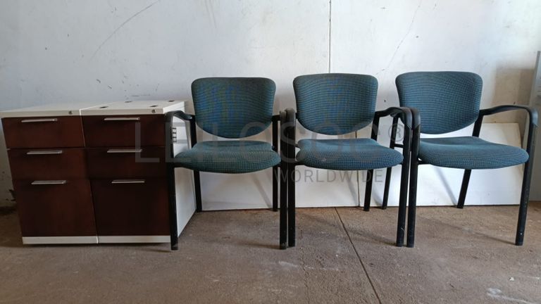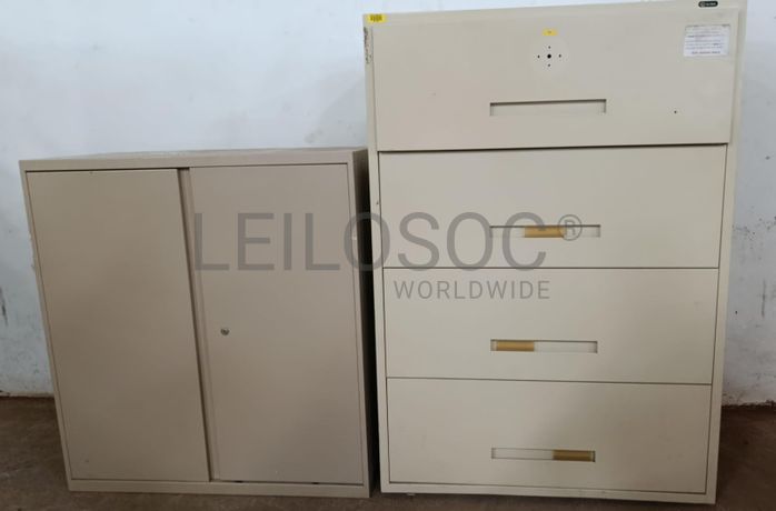 Um gaveteiro, um armário de duas portas, três cadeiras fixas, e dois blocos rodados