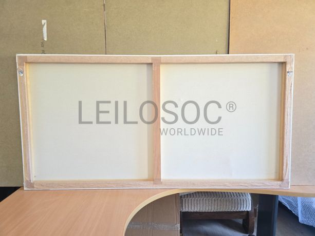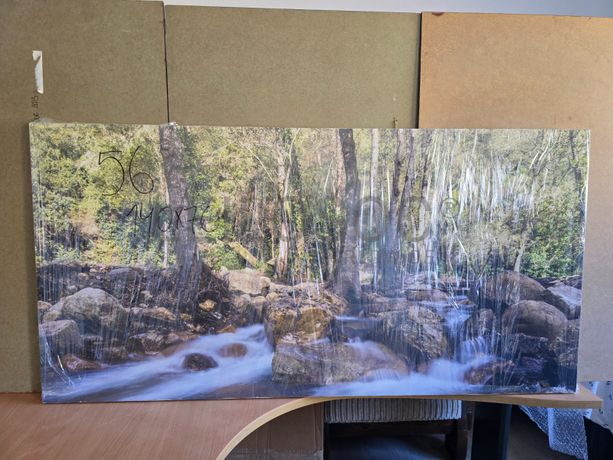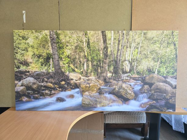 Tela de motivo natureza, de 140cm de comprimento e de 70cm de altura, com estrutura em madeira.