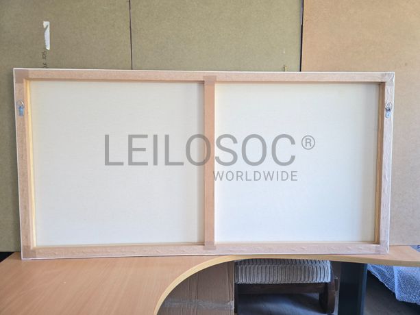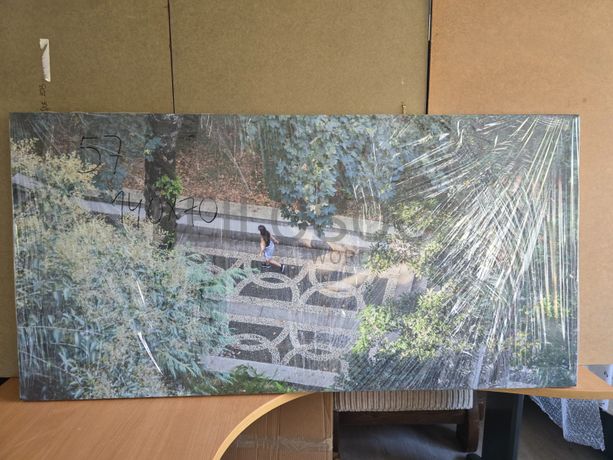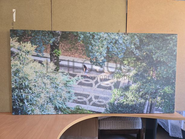 Tela de motivo natureza, de 140cm de comprimento e de 70cm de altura, com estrutura em madeira.
