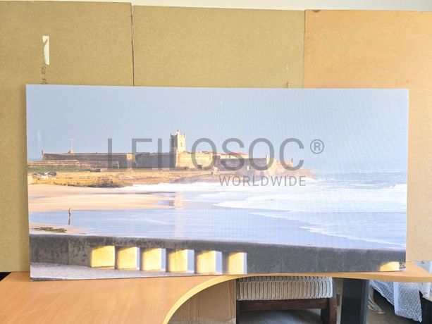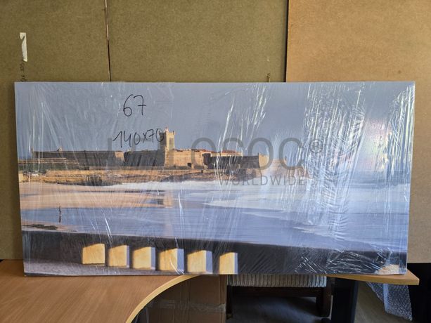 Tela de motivo natureza, de 140cm de comprimento e de 70cm de altura, com estrutura em madeira.