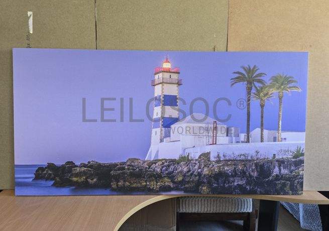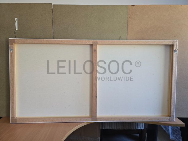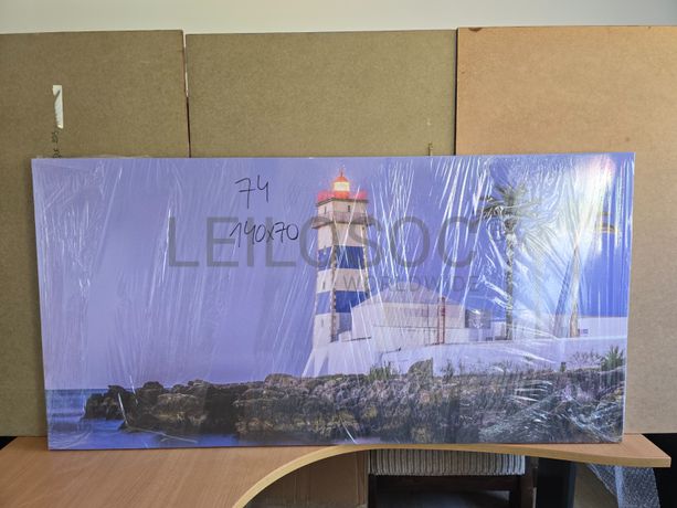 Tela de motivo natureza, de 140cm de comprimento e de 70cm de altura, com estrutura em madeira.