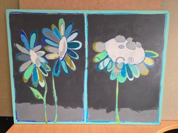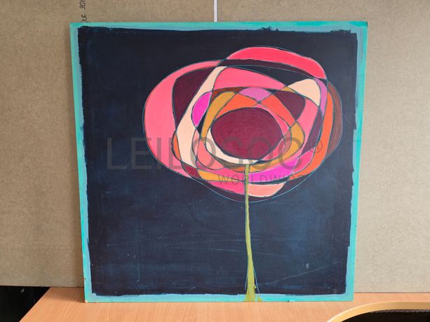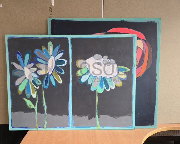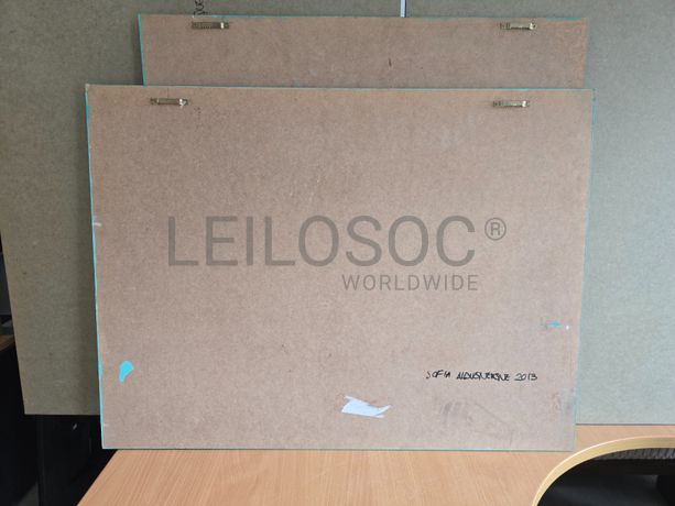 Conjunto de duas telas pintadas à mão, com assinatura de autora, de 70x70 e 80x60 centímetros.